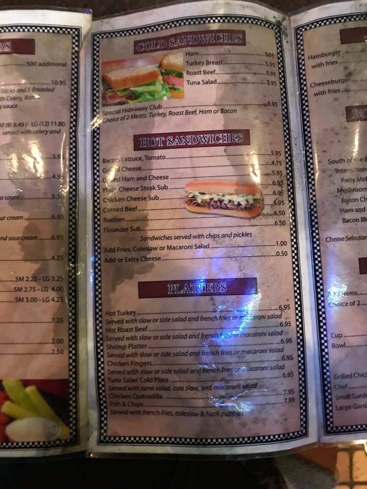 Welcome to The Hideaway, a divey and casual spot located in Clinton, MD. This hidden gem offers a loud and lively atmosphere, perfect for group gatherings and fun nights out. The menu features delicious options like Breaded Mushrooms, Jalapeno Poppers, Ham and Turkey Sandwiches, Hot Roast Beef and Turkey Platters, and more. Customer reviews rave about the friendly staff, great drinks, and tasty food offerings. The Hideaway is a must-visit for those looking for an old school vibe with pool tables, karaoke, and a full bar. Don't miss out on their Sunday specials and must-try dishes like the fried fish, wings, and seafood salad. With a cozy ambience and a variety of entertainment options, The Hideaway is a neighborhood bar worth revisiting.